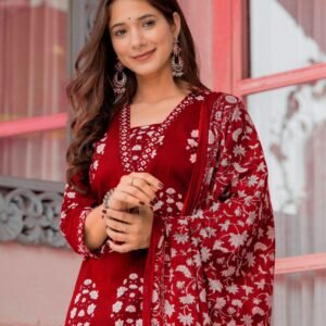 PARTHVI Women’s Pure Cotton Printed Straight Kurta Set with Palazzo Pants & Dupatta- Ethnic Wear, Red