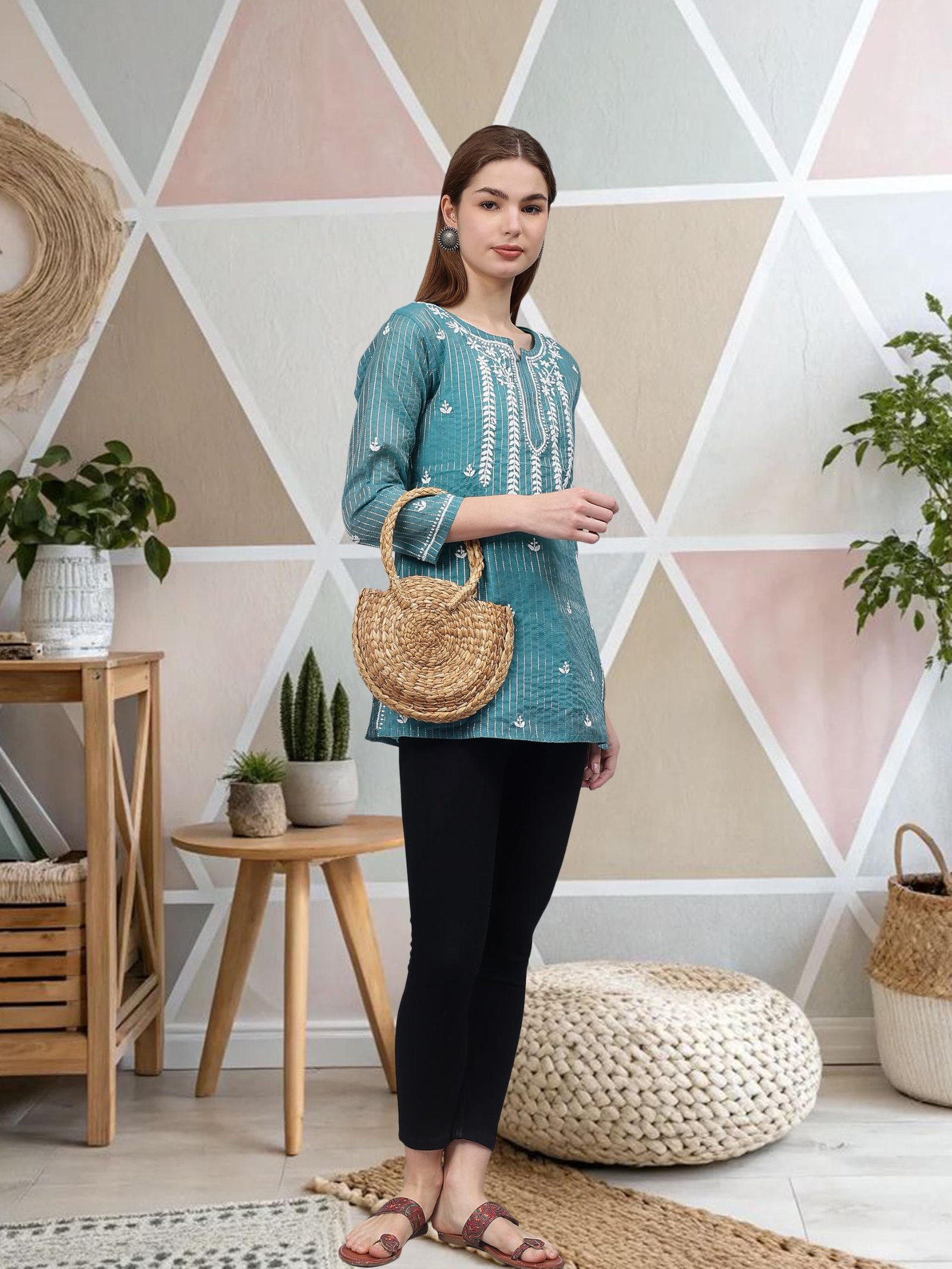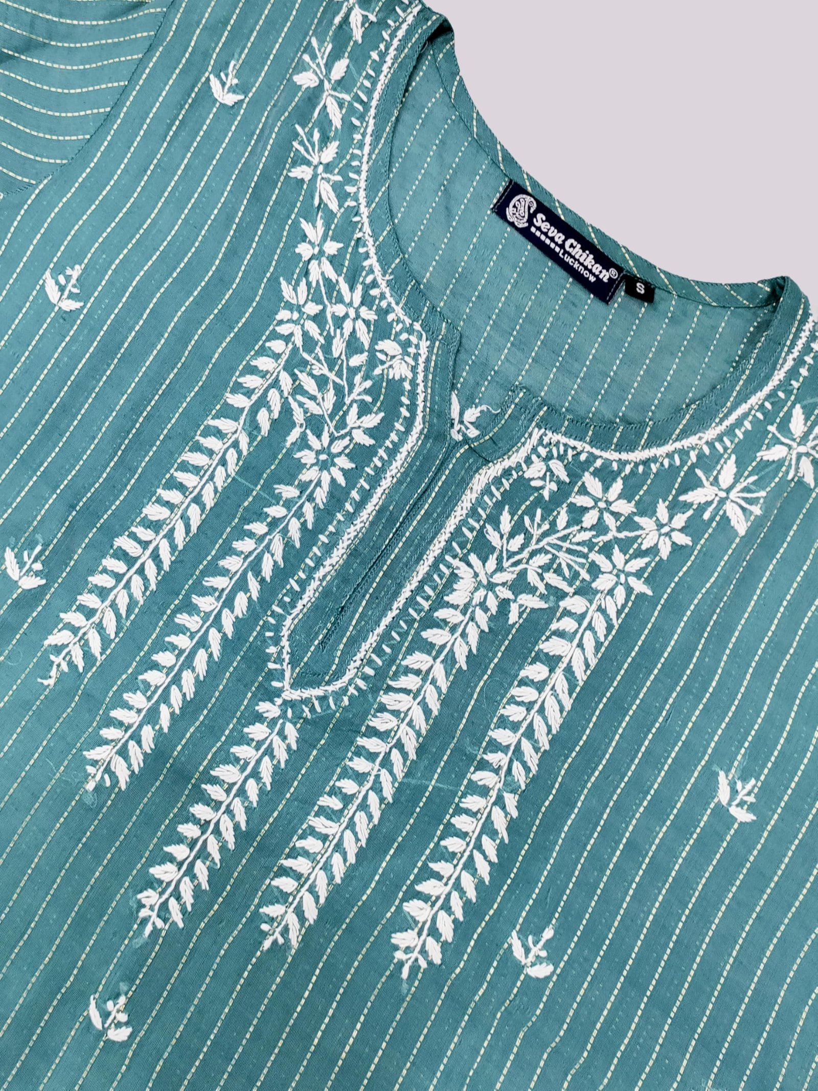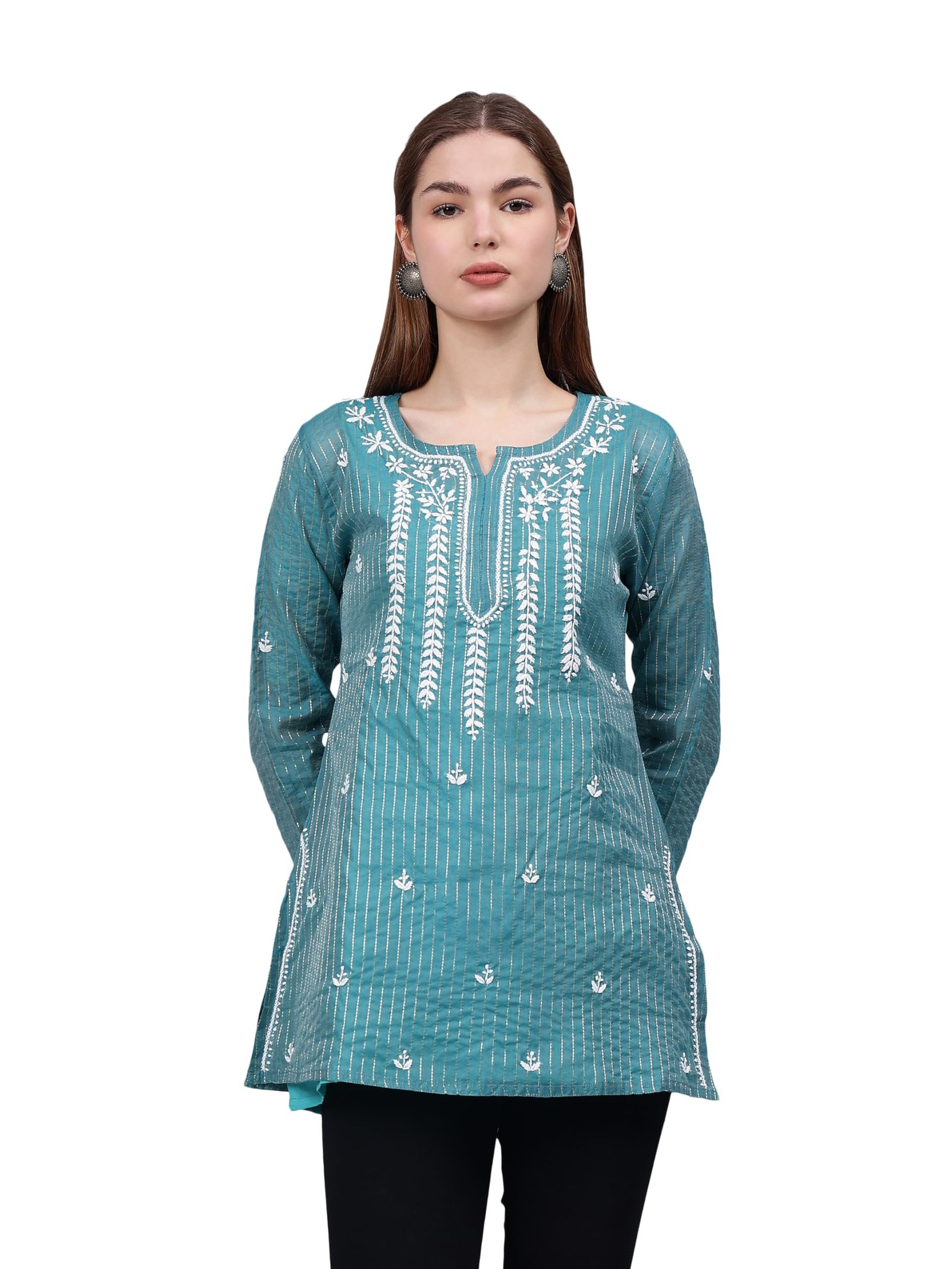 SKU : SCL9219, Fabric: Chanderi, Color: White, Embellishment : Zari Work , Length: 31 Inches Neck: Round-shape ,Thread Color: White ,Sleeves: 3/4 Sleeve Sleeves, Slit Detail: Side Slit, Embroidery: Bakhiya & Phanda, Washing Instructions: Handwash Only Delineation: Purchase this elegant and comfortable White chikan top online from Seva, is ideal for any fashionista. It has White coloured rich and attractive chikan embroidery. Buy this classic kurti for any occasion, any festival and any party celebrations. Disclaimer: There may be some minor dissimilarities in crafting and embroidery than showcase image. Since it is handcrafted product and these minor differences are natural when the crafting procedure has human involvement. However, these crafting changes are beautiful likewise show uniqueness. Note: Product maybe altered down by one size if required. For instance, size 40 can be altered to size 38.