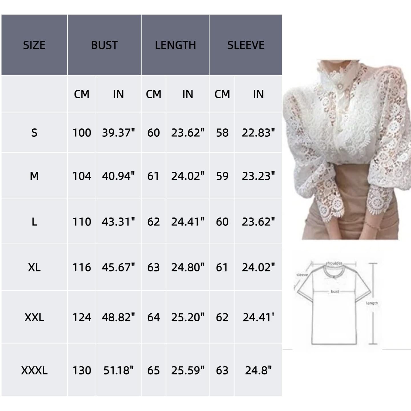 • Unique hollow out lace crochet design, long puff sleeve, button down closure, stand collared, Pleated, solid color, regular fit.